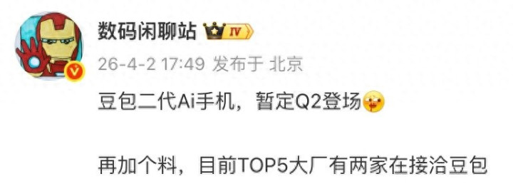 4 月 2 日音信,本日有爆料露馅,豆包二代 Ai 手机暂定本年第二季度迅速。爆料还称,现在 TOP5 大厂中有两家正在商讨豆包。意味着后续可能会有主流厂商的手机内置豆包助手,或选拔豆包提供的相关技能。
