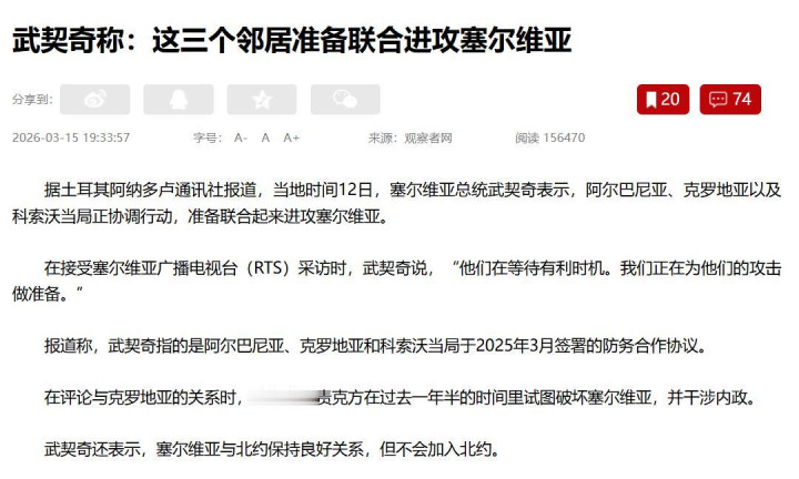 据不雅察者网3月15日报谈,塞尔维亚总统武契奇发表了一段至极凝重的言语,“他们在恭候有益时机,塞尔维亚正在为他们的攻击作念准备。”