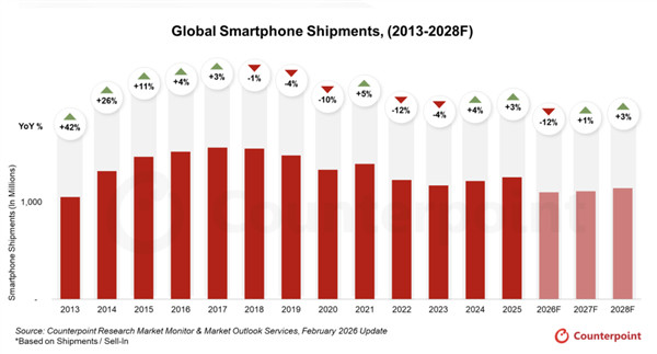 快科技3月16日音尘,据报谈,独特据分析浮现,2026年公共智高手机出货量瞻望同比着落12.9%,商场限制将减少约1.6亿部,创下近十年最大跌幅。