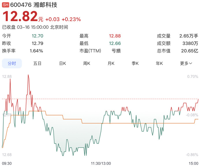 收尾3月16日收盘,湘邮科技涨0.23%,报12.82元/股,总市值20.65亿元。