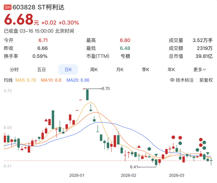 收尾当天,ST柯利达股价报6.68元/股。